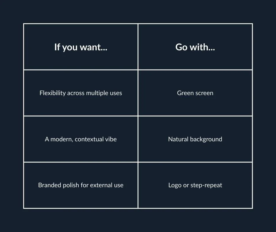 Another strong option is to shoot against a custom backdrop with your company logo or brand colors. We can either print one for you or simulate it digitally if we shoot on green screen.