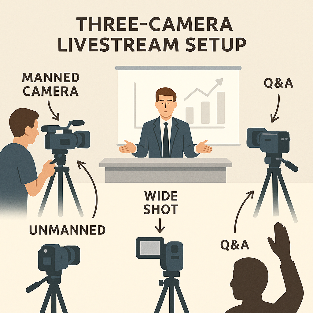 If we’re talking two or more cameras (especially manned), that changes the crew, setup time, coordination, and gear loadout. An unmanned wide + a manned close-up is common, but costs less than a two-person crew. Add remote PTZ? Different setup.