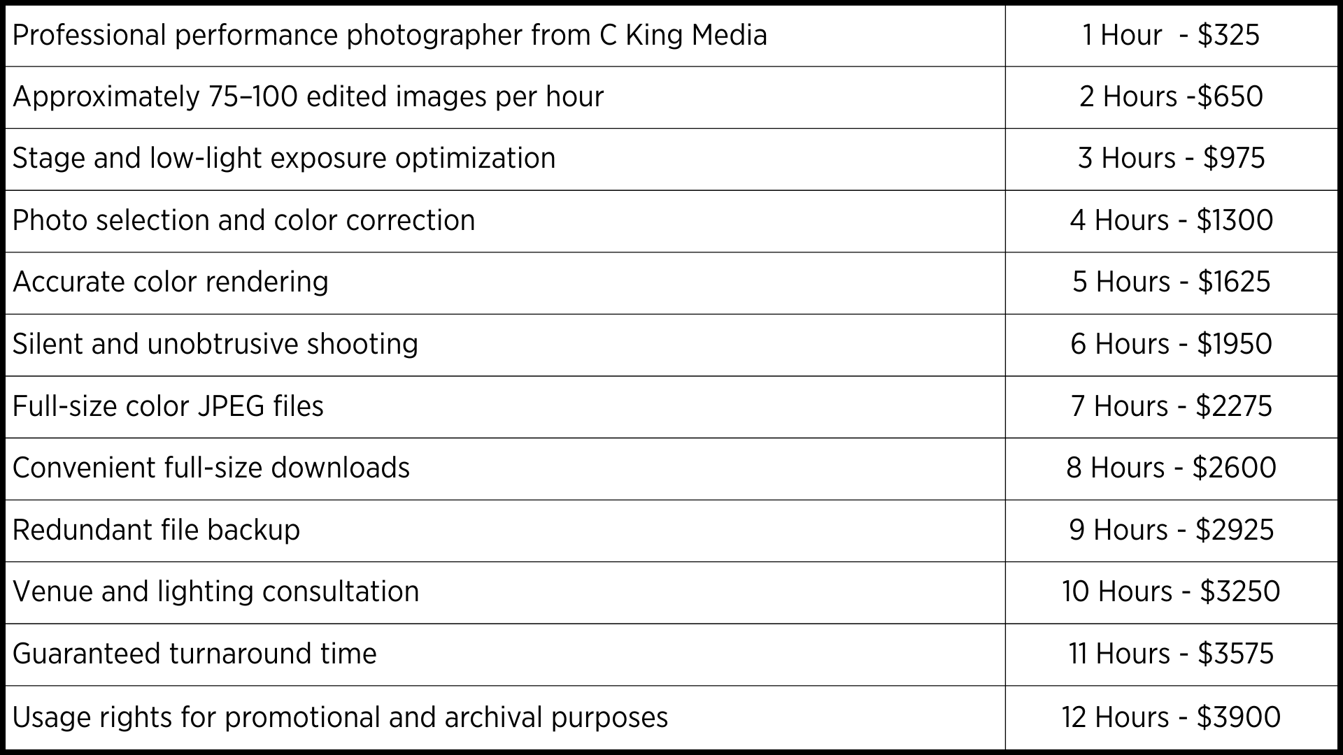If pricing alone doesn’t answer all your questions, you may want to view recent performance work or learn more about our approach to photographing live productions.